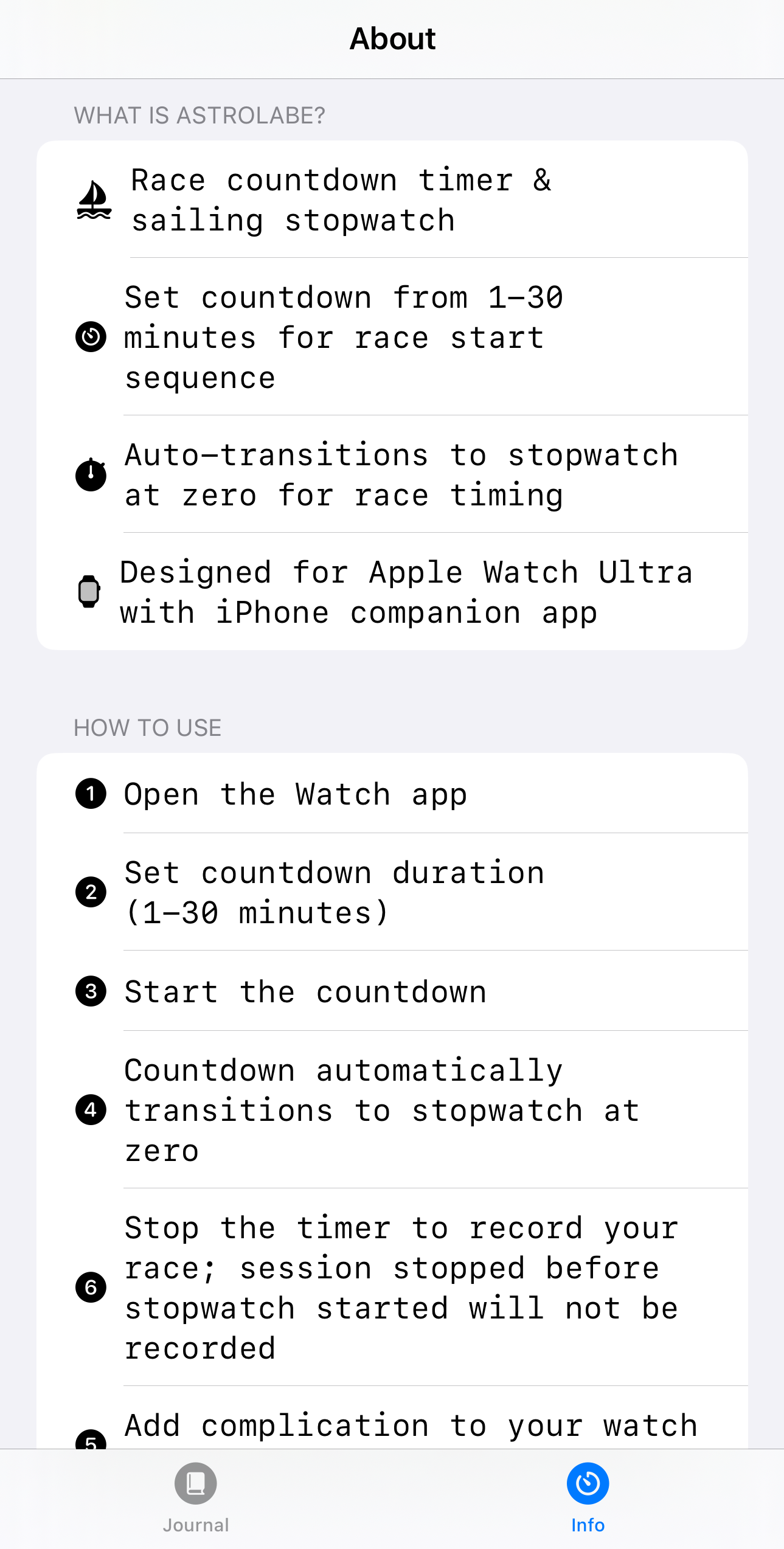 Astrolabe Countdown is a precision racing timer crafted specifically for Apple Watch. Designed with a focus on reliability and ease of use during critical race moments.